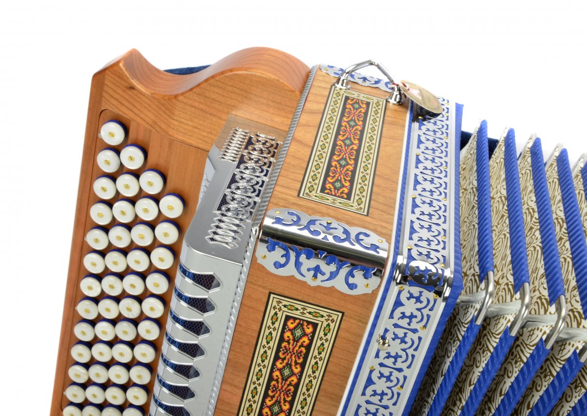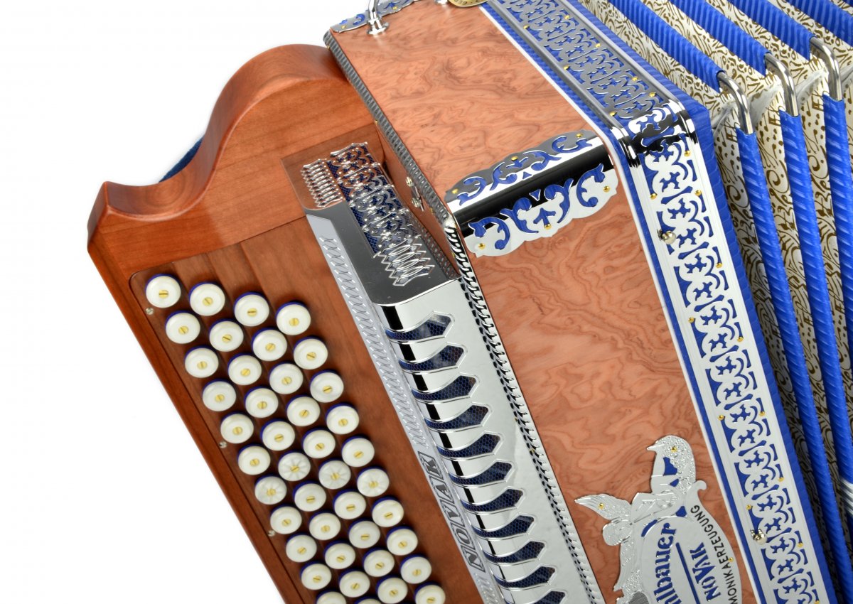 Die Sonorum Madrona/blau beeindruckt durch ihre schlichte Optik. Den strahlenden Glanz erhält die Harmonika durch eine seidenmatt lackierte Holzoberfläche, ergänzt mit verchromten Edelstahlbeschlägen.